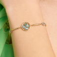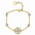 Dámsky oceľový náramok Brosway z kolekcie Chakra s krištáľmi a so symbolom štvorlístka s perleťou. Náramok je pozlátený žltým zlatom.