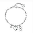 Oceľový dámsky náramok BROSWAY zdobí prívesok v tvare srdca, symbol nekonečna a drobný číry krištáľ na retiazke z guľôčok.