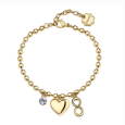 Oceľový dámsky náramok BROSWAY so žltým pozlátením zdobí prívesok v tvare srdca, symbol nekonečna a drobný číry krištáľ na retiazke z guľôčok.