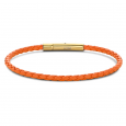 Dámsky kožený náramok oranžovej farby s oceľovým zapínaním. Oceľ je pozlátená žltým zlatom.