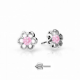 Detské náušnice z bieleho 14 karátového zlata, v roztomilom dizajne kvietkov, zdobené ružovým zirkónom.