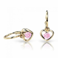 Detské náušnice zo žltého 14 karátového zlata, v roztomilom dizajne srdiečok, zdobené ružovým zirkónom.