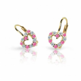 Detské náušnice zo žltého 14 karátového zlata, v roztomilom dizajne srdiečok, zdobené striedavo čírymi a ružovými zirkónmi.