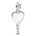 Dámsky strieborný prívesok PANDORA v podobe kľúča s gravírovateľnou časťou v tvare srdiečka. Dizajn dopĺňa jeden číry zirkón osadený v hladkom lôžku, spolu s drobnými čírymi zirkónmi osadenými na tele kľúča. Jemné ryté detaily a kombinácia rôznych tvarov kameňov dodávajú šperku elegantný a prepracovaný charakter.