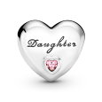 Strieborná PANDORA korálka v tvare srdiečka s nápisom „Dcéra“ a ružovým zirkónom. Pripomínajte si stále lásku vašej dcéry.