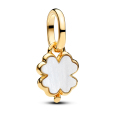 Pozlátený PANDORA ME visiaci prívesok má tvar štvorlístka s perleťou, ktorú zvýrazňuje jemný pozlátený rám. Dizajn dopĺňa závesné očko a na zadnej strane nechýbajú dekoratívne detaily hviezdy, žilkovania a stopky.