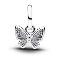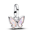 Strieborný PANDORA ME visiaci prívesok má tvar motýľa s detailom z ružového laboratórne vytvoreného opálu, ktorý vytvára jemný dúhový efekt.