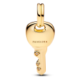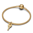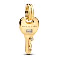 Pozlátená PANDORA korálka kľúč so zirkónmi - leštený kľúč s čírymi zirkónmi a gravírovaným nápisom. Nápisom „NO DUPLICATES" (ŽIADNE KÓPIE), pričom jedna strana je ponechaná hladká.