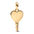 Dámsky pozlátený prívesok PANDORA v podobe kľúča s gravírovateľnou časťou v tvare srdiečka. Dizajn dopĺňa jeden číry zirkón osadený v hladkom lôžku, spolu s drobnými čírymi zirkónmi osadenými na tele kľúča. Jemné ryté detaily a kombinácia rôznych tvarov kameňov dodávajú šperku elegantný a prepracovaný charakter.