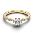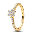 Pozlátený prsteň PANDORA zdobí kvetinový motív z čírych zirkónov, ktorý dopĺňajú ďalšie číre zirkóny osadené na hornej časti obrúčky. Dizajn pôsobí jemne a žiarivo, s dôrazom na čisté línie a trblietavý detail.