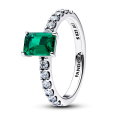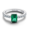 Strieborný prsteň PANDORA zdobí obdĺžnikový krištáľ v odtieni kráľovskej zelenej. Hornú časť obrúčky dopĺňajú číre zirkóny, ktoré dodávajú šperku jemný trblietavý detail.