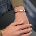 Pánsky náramok POLICE kombinuje pletenú čiernu kožu v s hladkým oceľovým prvkom v striebornom odtieni a jemným monogramom.