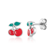 Detské strieborné náušnice čerešničky s červenou a zelenou glazúrou.