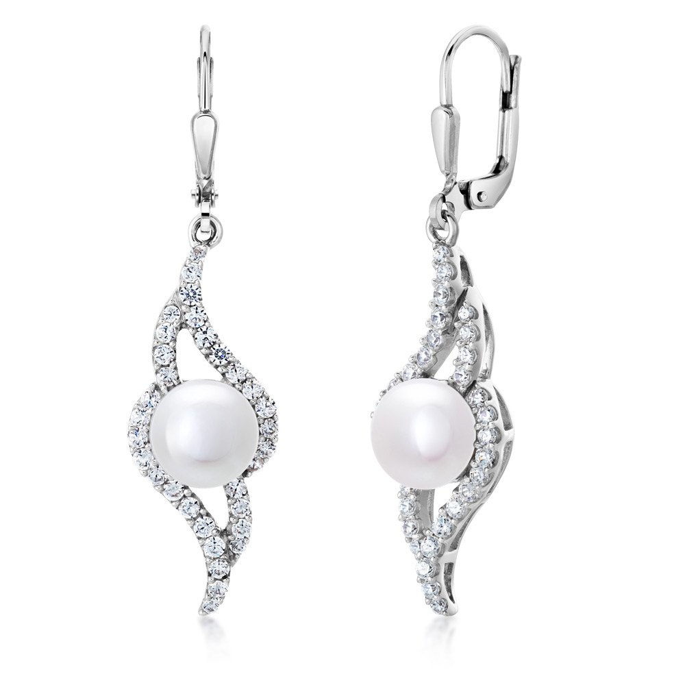 Strieborné náušnice s bielou sladkovodnou perlou, zdobené zirkónmi čírej farby.