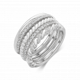Dámsky strieborný prsteň s piatimi rôznymi obrúčkami zdobený čírymi zirkónmi.