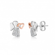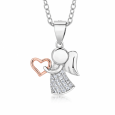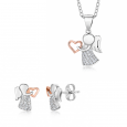 Strieborný set pozostávajúci z prívesku a náušníc v tvare anjela držiaceho srdce. Srdce je pozlátené ružovým zlatom.