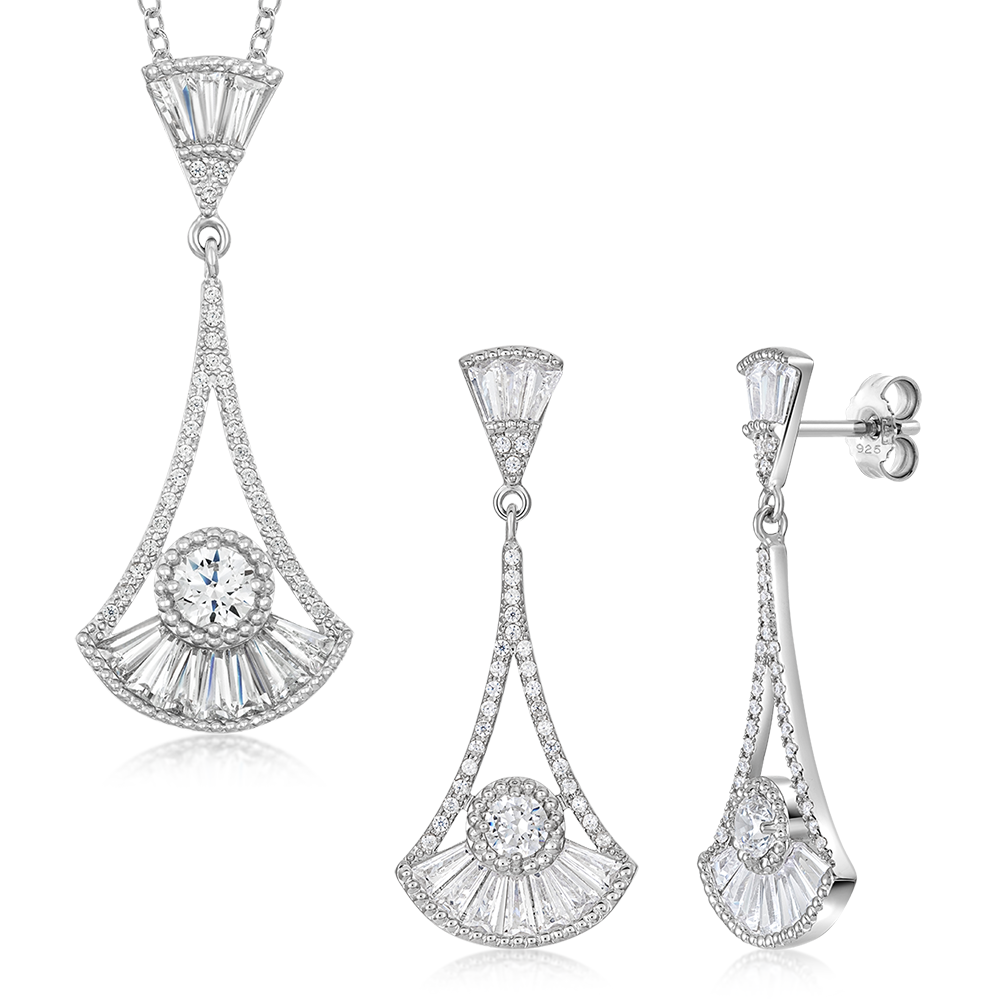 Strieborný set so zirkónmi, pozostávajúci z prívesku a náušníc.