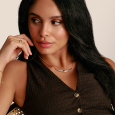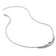 Dominantou náhrdelníka je jemne zakrivený dekor, v ktorom sa v strede nachádza červený kameň doplnený čírymi zirkónmi a tyrkysovými akcentmi. Kombinácia farieb pôsobí sviežo a zároveň výrazne, pričom čisté línie podčiarkujú moderný charakter šperku. Minimalistické spracovanie v striebre z neho robí univerzálny doplnok vhodný na každodenné nosenie aj špeciálne príležitosti.