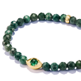 Náramok je tvorený fazetovanými korálkami zeleného achátu, ktoré vynikajú prírodnými odtieňmi zelenej a jemným leskom. Dominantou je stredová korálka zo striebra s 18k pozlátením v motíve oka, doplnená zeleným sklo-keramickým kameňom a detailnými gravírovaniami. Tento prvok dodáva šperku hlbší význam a jedinečný charakter.