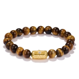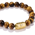 Náramok je tvorený pravidelnými, leštenými korálkami tigrieho oka, ktoré vynikajú typickým zlatohnedým odleskom. Dominantou je stredová korálka zo striebra s 18k pozlátením, zdobená symbolickými gravírovaniami (podkova, mesiac, oko), ktoré podčiarkujú jeho ochranný význam.