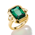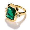 Dominantou prsteňa je zelený kameň v oktagonovom bruse, ktorý zaujme svojou žiarivou farbou a presne brúsenými hranami. Po jeho stranách sú osadené číre zirkóny, ktoré zvýrazňujú jeho tvar a dodávajú šperku jemný lesk. Pozlátený povrch podčiarkuje jeho luxusný vzhľad a robí z neho výrazný doplnok na každodenné nosenie aj špeciálne príležitosti.
