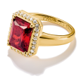 Dominantou prsteňa je sýto červený kameň v precíznom osemuholníkovom výbruse, ktorý zaujme svojou hĺbkou a intenzívnym leskom. Okolo centrálneho kameňa sú jemne osadené číre zirkóny, ktoré zvýrazňujú jeho tvar a dodávajú celému dizajnu žiarivý efekt. Pozlátené prevedenie podčiarkuje luxusný vzhľad a robí z prsteňa ideálny doplnok na výnimočné príležitosti aj výrazný každodenný styling.