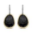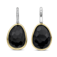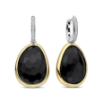 Strieborné dámske náušnice TI SENTO so žltým pozlátením s čírymi zirkónmi a čiernym kameňom majú elegantný visiaci tvar s jemným leskom.