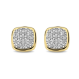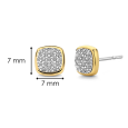 Strieborné dámske náušnice TI SENTO so žltým pozlátením a čírymi zirkónmi majú štvorcový tvar s osadením drobných kameňov.