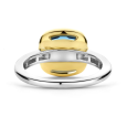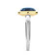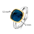 Strieborný prsteň TI SENTO v platinovom tóne dopĺňa žlté pozlátenie na osadení a dominuje mu tmavomodrý krištáľ v tvare vankúšika, ktorý vytvára výrazný farebný akcent na hladkej obrúčke.